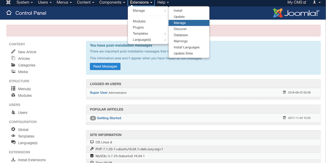 After ensuring that the core software is fully updated, you'll want to check your extensions as well. It’s important to keep all of your extensions up to date, since most developers upgrade them for compatibility with the current version of Joomla. Extensions that go too long without an update may open your site to security vulnerabilities, and may conflict with other extensions (or Joomla itself).