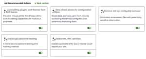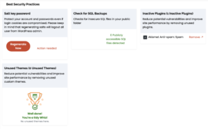 Plus, TurboHub recommends actions to eliminate security vulnerabilities. From salt key status to inactive plugins or themes, you can take immediate action directly from the control panel. In most cases, you can enhance your security with one click.