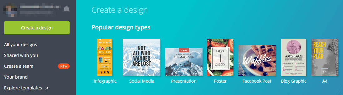 To get started, just sign up for a free account on Canva and then look for the option to create an infographic among the design types on your dashboard. Then, move on to step one.