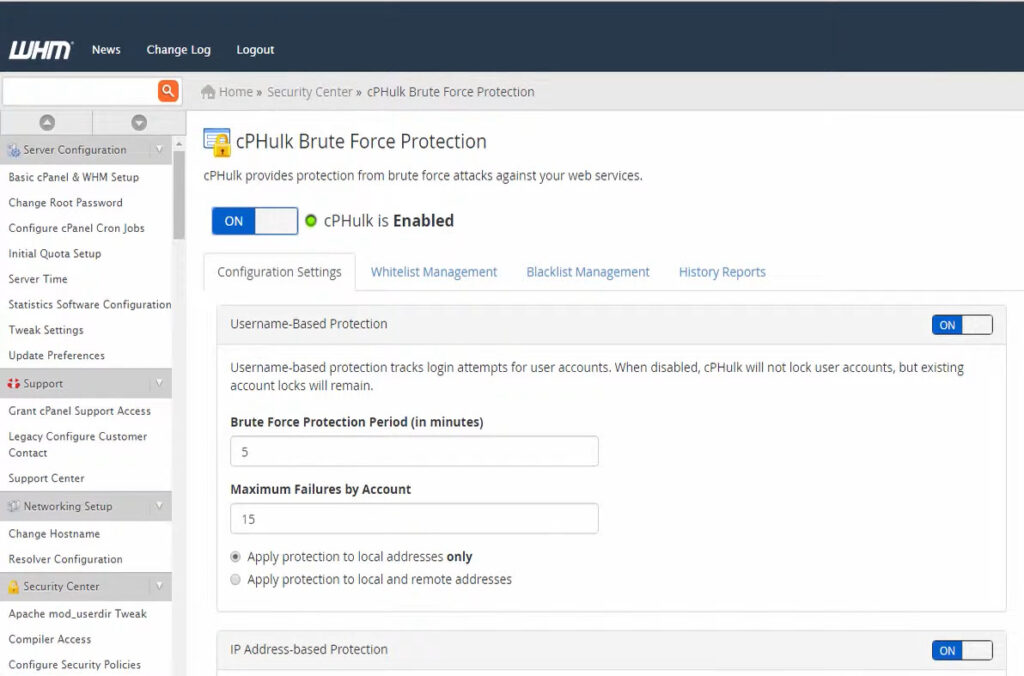 Using cPHulk through cPanel will enable you to block the IP address or accounts exhibiting suspicious behavior automatically. This prevents attackers from carrying out any further attempts to log in, thus preventing them from gaining unauthorized access and installing malware on your site.