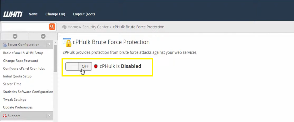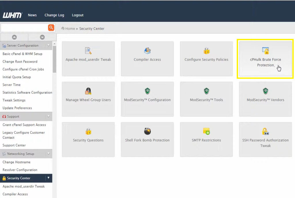 To enable CPHulk Brite-Force protection, you’ll first need to log in to WHM. From there, navigate to Security Center in the left-hand sidebar, and click on cPHulk Brute Force Protection: