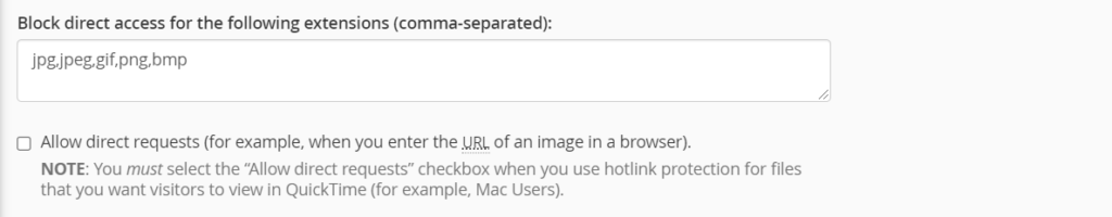 Again, the above box should be automatically pre-populated with commonly hotlinked file extensions. However, you might want to add extra file extensions that aren’t already included.