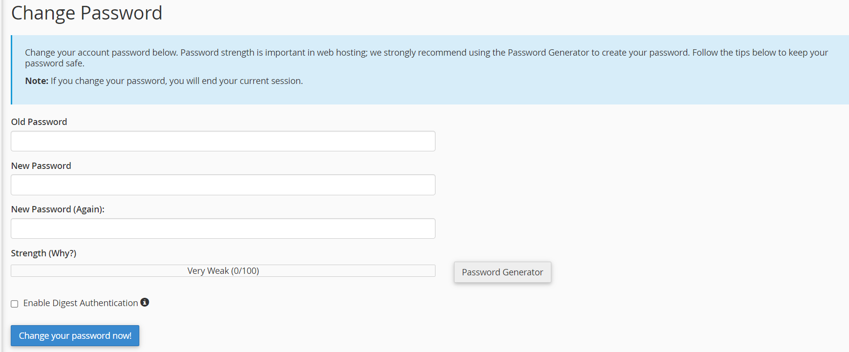 Thankfully, with cPanel, it’s easy for you to reset your password. It even comes with a password generator to help you protect your site using strong credentials. To keep your site as safe as possible, it’s recommended that you change all passwords on a regular basis. Configuring them around once a month is usually sufficient.