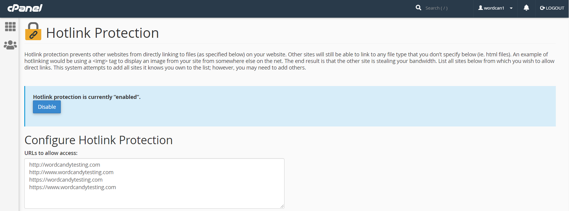 On the next page, you can toggle Hotlink protection ON or OFF. You can also change your configuration settings. For example, you might want to specify certain URLs that are allowed to access your files (cPanel will automatically populate this box with suggested local URLs):