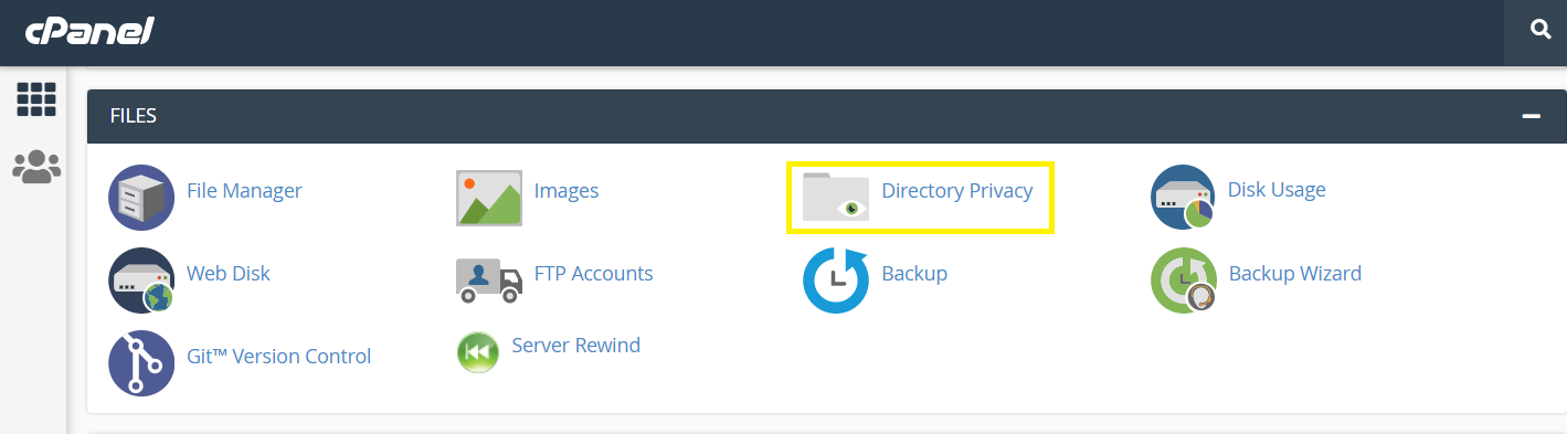 To add password protection to a directory, start by logging into cPanel. Next, scroll down to the Files section and click on Directory Privacy: