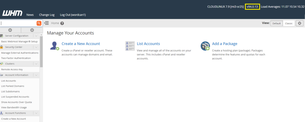 If you do need to update it manually, start by logging into WebHost Manager (WHM). In the upper right corner of the main WHM screen, you should be able to see the current version of cPanel you’re running:
