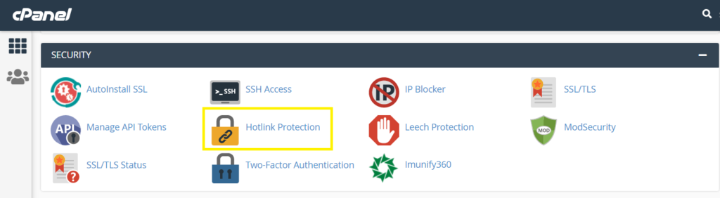 First, log in to cPanel and scroll down to the Security section. Then, click on the Hotlink Protection icon:
