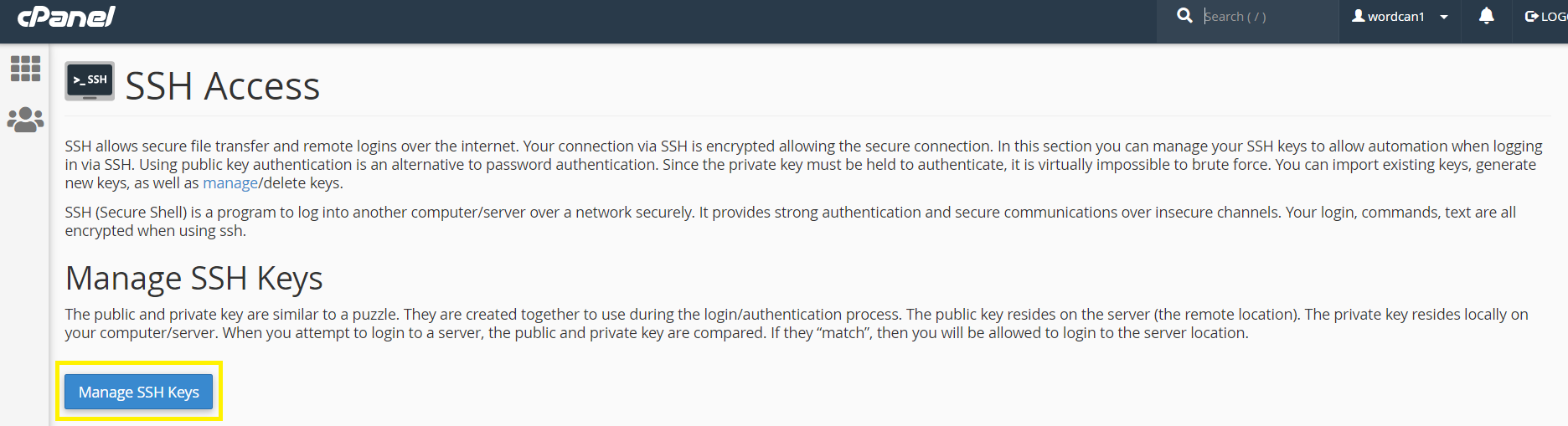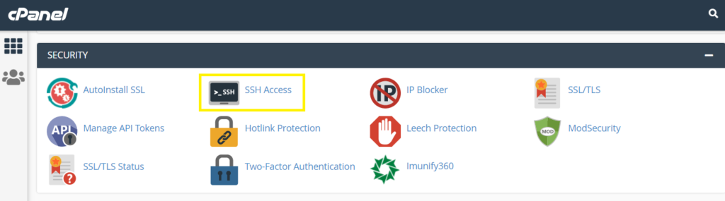 In order to transfer files using SFTP, you’ll need your main cPanel account’s private key for authentication. To find it, log in to cPanel and scroll down to the Security section. Then, click on SSH Access: