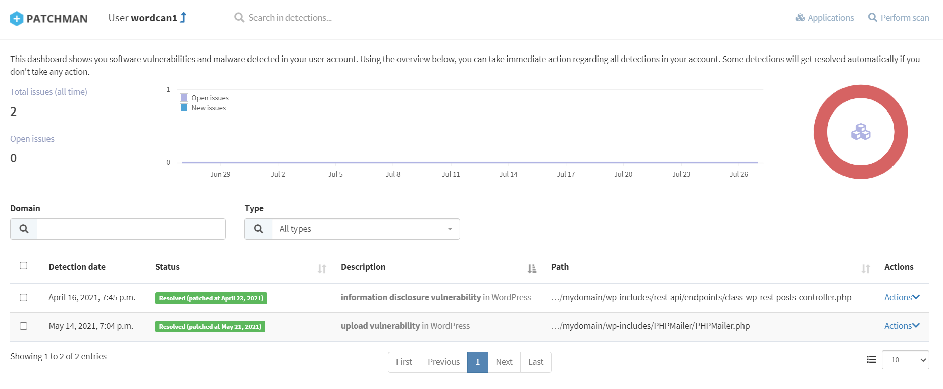 Not only that, but Patchman also detects whether your WordPress, Drupa, or Joomla installation requires patching. Again, it will notify you of this by email and automatically apply the patch if you don't fix it yourself within a week.