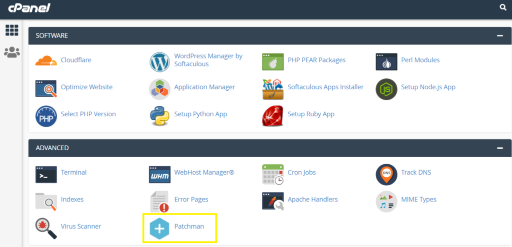 However, if you want to manage your settings or carry out specific administrative tasks, you can do so by accessing the Patchman dashboard. To get to the dashboard, start by logging into cPanel, then click on Patchman in the Advanced section: