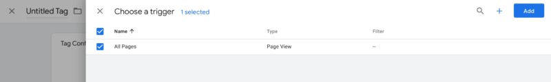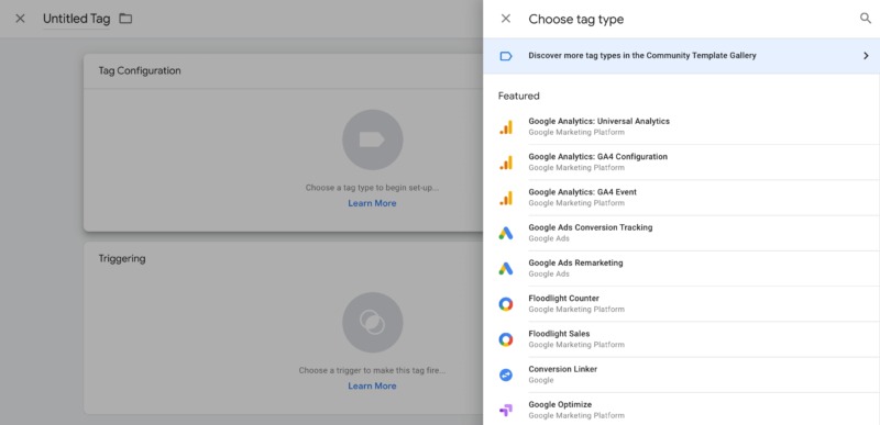 In the Tag Manager dashboard, you can create your first tag by clicking on Add a new tag. In the subsequent panel, give this tag a name. Then you can select anywhere in the Tag Configuration box and choose the type of tag that you want to create: