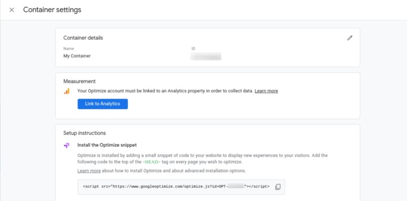 To enable Google Optimize, you’ll need to create an Optimize account. After logging into your account, select the Settings icon. This launches a panel that displays your container ID. Please make a note of this information, as you’ll be using it to complete the integration: