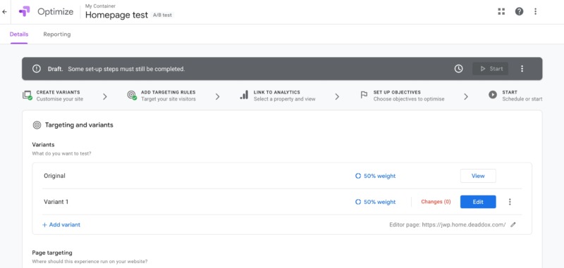 You can create and test variations using Google’s Optimize service. Optimize is different than the integrations we’ve explored in the above sections. Even after configuring the connection with your WordPress site, you’ll still create and manage your tests in the Optimize dashboard: