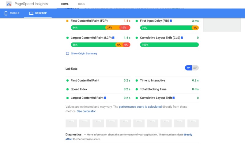 You can also use the tabs to toggle between PSI’s field and lab data. Field data is based on your website’s historical performance. Meanwhile, the lab data is based on the simulated load on a single device and a fixed set of network conditions. These data sets will often differ, so we recommend comparing and contrasting the information in both tabs.