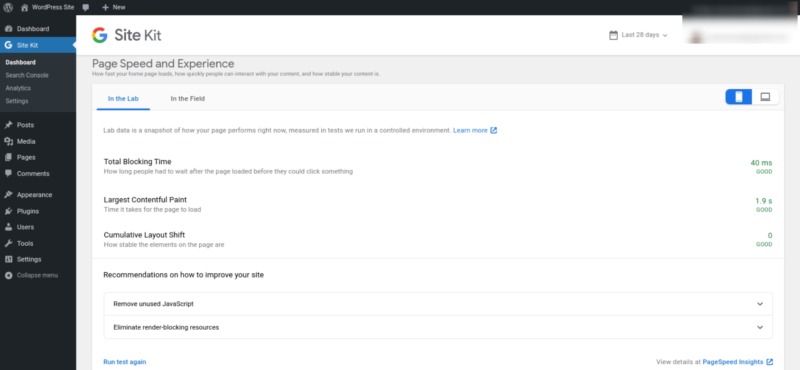 Site Kit also integrates with PageSpeed Insights (PSI). Unlike some competing analytics tools, PSI provides both lab and field data to deliver valuable insights into your site’s performance across both desktop and mobile devices: