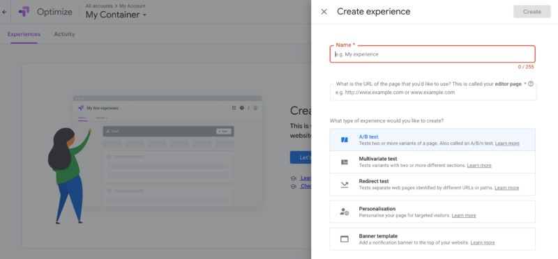 Once Optimize is connected to your website via Google Site Kit, you can create tests using the external Optimize console. To run a simple test, switch over to the Optimize dashboard and select Let’s Go. You can choose the type of test that you want to start: