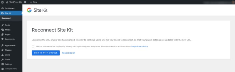 If you’ve navigated away from the setup screen and cannot currently see the above message, you can browse to Site Kit > Dashboard > Sign In With Google: