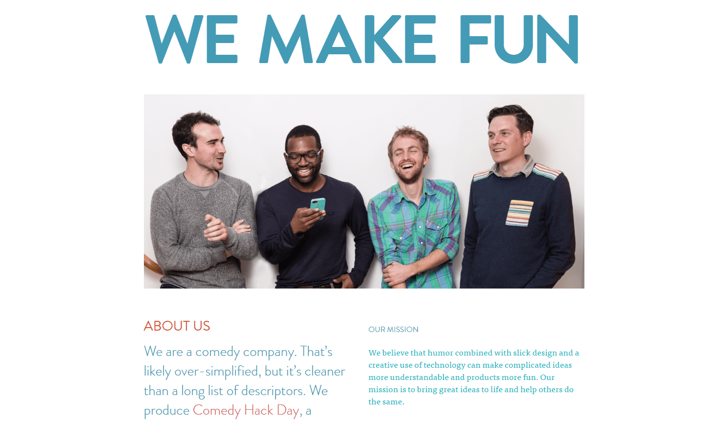 If you have more than five employees, consider using a group shot instead of a long laundry list of photos and bios. A group photo can highlight your team’s chemistry, since eye contact, physical closeness, and genuine smiles demonstrate subconscious signs of camaraderie: