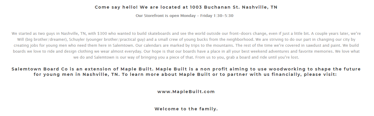 The About page gives people a chance to get to know you and become invested in your mission. After all, you want people to care about choosing your business, even if they can get cheaper goods at the Walmart down the road (for example). Some independent stores may even benefit from a Why Shop With Us? section.