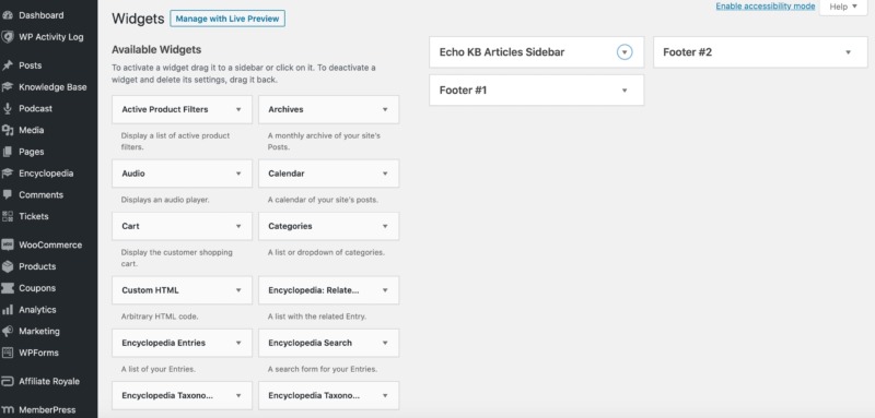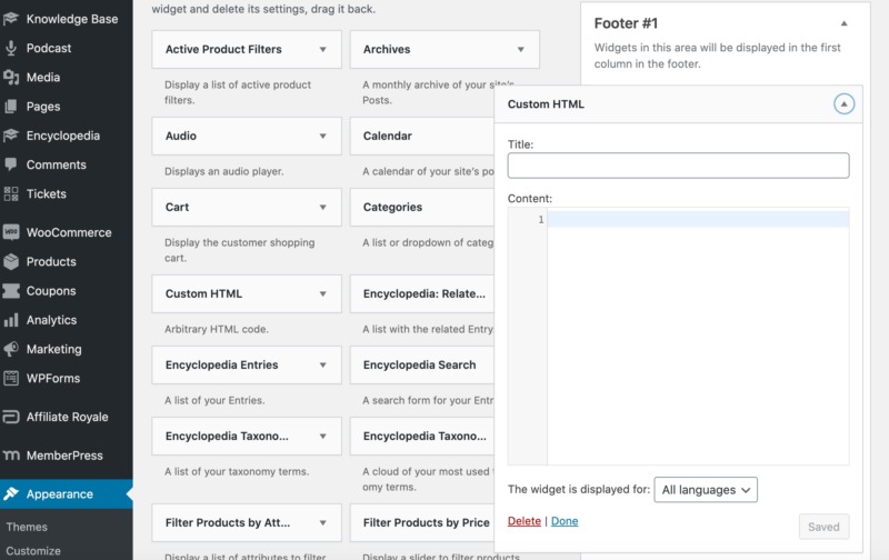 You can then select the Custom HTML widget, and drag it to the Sidebar or Footer column(s). Note that the available options may vary depending on your WordPress theme.