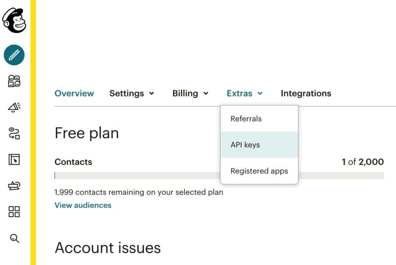 To request an API key, log into your Mailchimp account. In the bottom-left corner, select your profile picture and then choose Account. On the subsequent screen, select Extras > API keys.