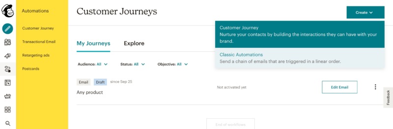 To setup an RSS to Email campaign, switch over to your Mailchimp account. You can then select Automations > Customer journey. In the upper-right corner, select Create > Classic Automations.