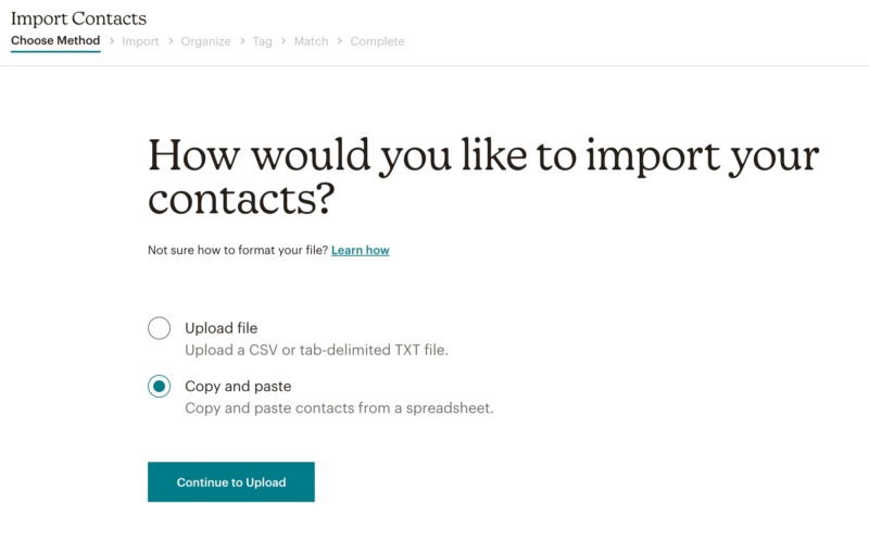 Typically, the quickest method is to upload these contacts as a Comma-Separated Value (CSV) file. Once you’ve formatted your CSV file according to Mailchimp’s requirements, you just need to upload that file to Mailchimp, using the dedicated upload tool.