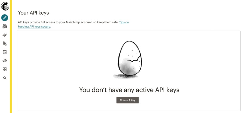 Under Your API Keys, select Create A Key. Mailchimp will now generate an API key.