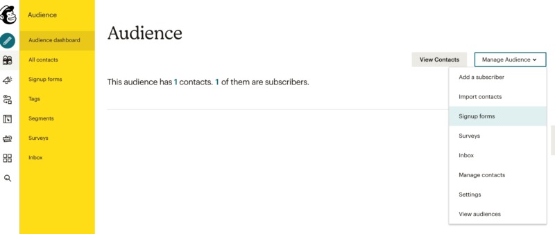 An embedded form is particularly useful for encouraging signups, without disrupting the visitor experience. To create an embedded form, switch back to the Mailchimp dashboard, then select the Audience icon. Next, navigate to Audience dashboard > Manage Audience > Signup forms.