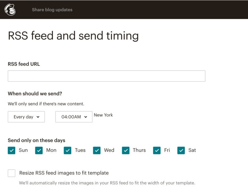 Now, give your campaign a descriptive name, and choose who should receive these updates. You'll now need to enter the URL of your website’s RSS feed, and specify the days and times when Mailchimp should send its RSS newsletters. Note that Mailchimp will only send an email when you have new content to promote.