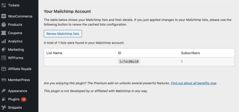 Since you’ve just connected your WordPress and Mailchimp accounts, we’d recommend pressing the Renew Mailchimp lists button. This will renew the cached lists configuration, and ensure you’re looking at the latest version of your Mailchimp data. It’s also worth pressing this button every time you make changes in your Mailchimp lists, just to ensure you’re seeing up-to-date information.