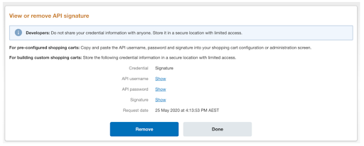Copy the API Username, Password, and Signature into your WooCommerce PayPal Checkout settings.