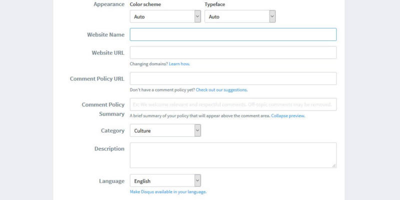 Copy and paste it to your Disqus account. After, it will take you to the configuration page. Here, you can change the color scheme and typeface for your comments section, as well as your website name and even a link to your commenting policy: