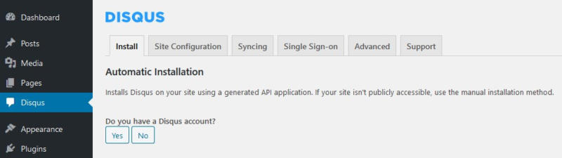 Once you have activated the plugin, it's just a matter of confirming whether or not you have a Disqus account and if you've registered your site on it. If not, you'll be prompted to go to the Disqus WordPress installation page: