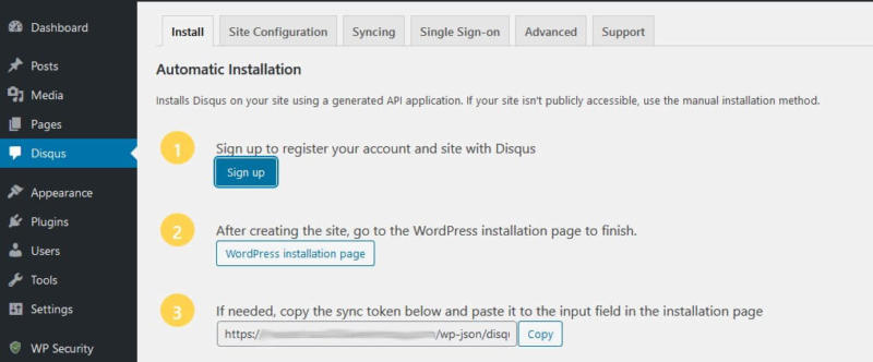 After that is done, your next step will be to connect Disqus with WordPress. To do so, you'll need to retrieve your installation token: