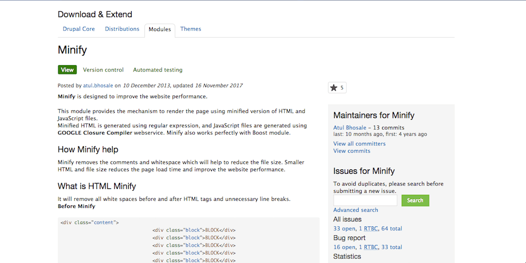 You can minify your code by installing the Minify module on your site. Visit the module page, download the tar.gz file, and unarchive it on your computer: