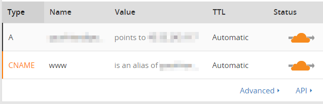On the next screen, Cloudflare will display a list of the DNS records associated with your domain name. You'll find a Cloudflare icon (an orange cloud with an arrow behind it) next to each record, as seen below: