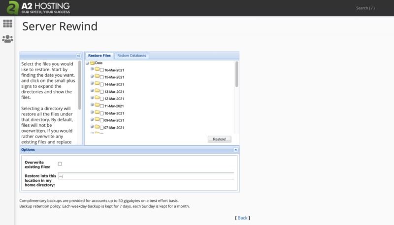 To start, select a date from the drop-down menu and click on Restore. Then you can repeat this process for the Restore Databases tab.