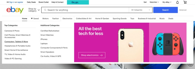 To drive conversions, your customers should be able to find their perfect product, in just a few clicks. WordPress supports a range of navigational menus. However, drop-downs are particularly popular, as selecting a parent category displays all the associated product subcategories. This is exactly what we see with many popular e-commerce sites, including eBay.