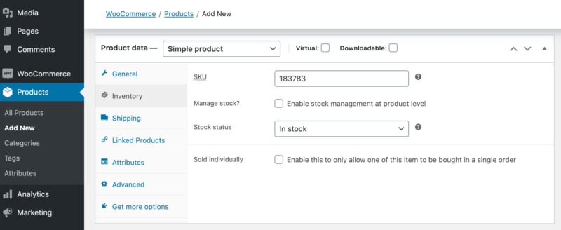 The next steps will vary, depending on the type of product you’re creating. For example, if you select Grouped product, you’ll be prompted to enter the product’s Stock-Keeping Unit (SKU). This is a unique string that represents this product in your e-commerce store. Alternatively, if you select Simple Product, you’ll be prompted to specify whether this product is downloadable.