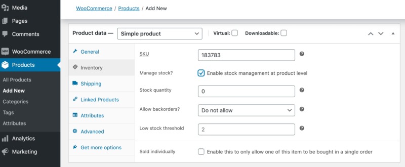 At this point, we’ve entered some basic information about our product. However, before we go ahead and publish the product, it’s a good idea to perform some stock management. This involves entering the total number of units currently in stock, and configuring some optional low stock warnings.