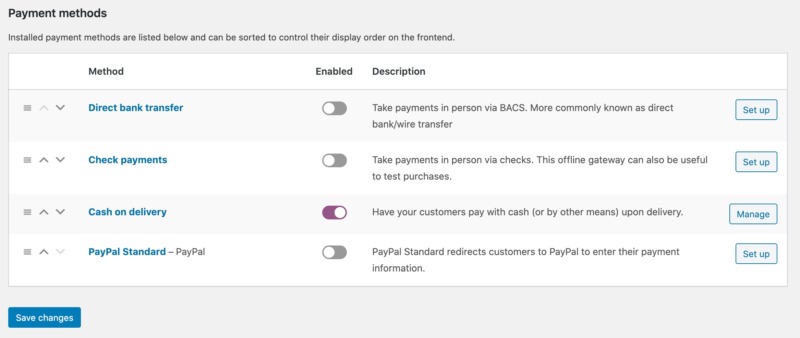 Once you’ve configured your payment gateway, select Save Changes. You can then enable the payment gateway by pushing its accompanying slider into the on position.