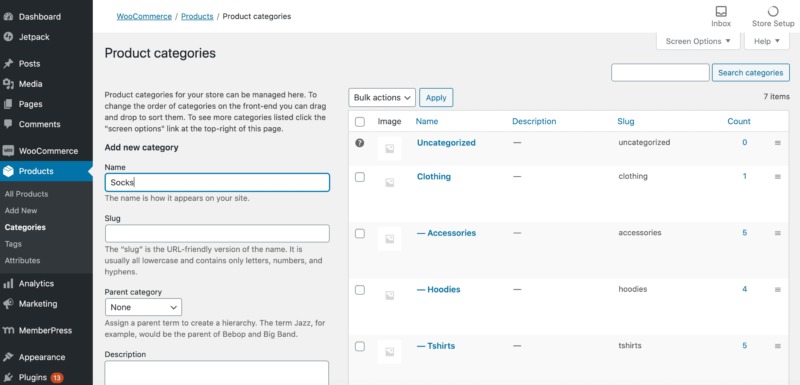 To create a product category, navigate to WooCommerce > Categories. In Add New Category, enter the name of the parent category that you want to create.
