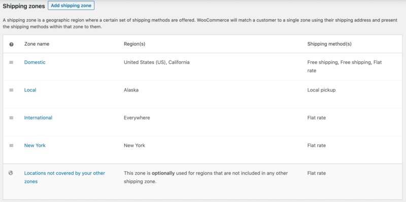 By default, WooCommerce generates the following option: Locations not covered by your other zones. If no appropriate zone is found, WooCommerce will default to this shipping zone. You can edit or delete this zone, as required.