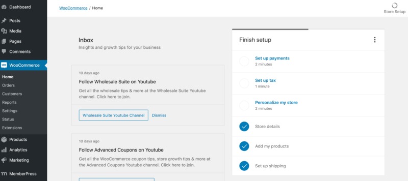 If you accidentally dismiss the Welcome message, don’t panic! You can simply select WooCommerce from WordPress’ left-hand menu. WordPress will now display a list of all the steps required, in order to successfully complete the initial WooCommerce configuration.