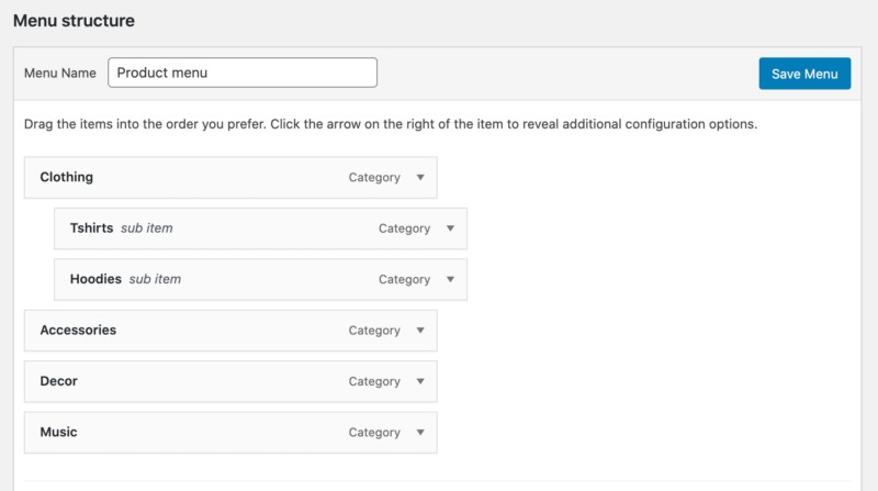 Since we’re creating a drop-down menu, position each subcategory beneath its parent. You can then grab each child category and drag it slightly to the right, so it appears indented beneath its parent.