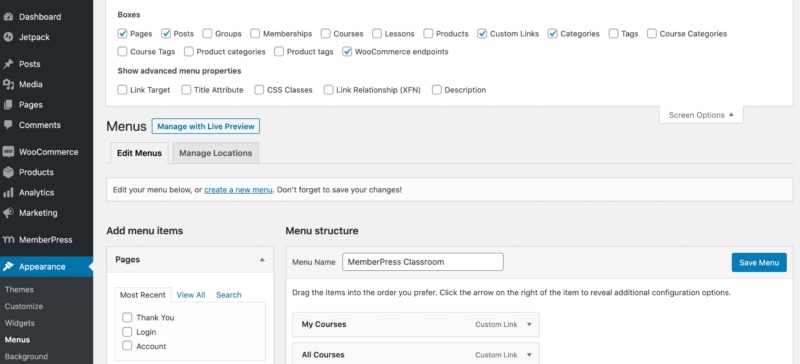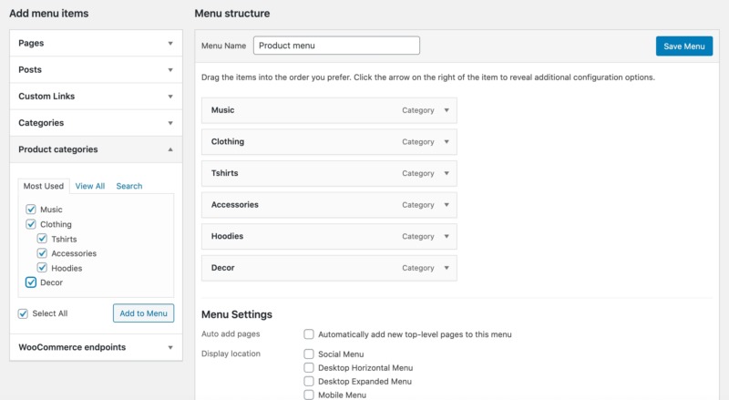By default, you can’t add product categories to a WordPress menu. To enable product categories, select Appearance > Menus > Screen Options. You can then select Product Categories.