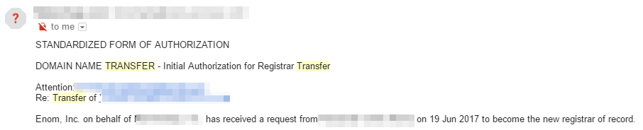 At this point, you should receive an email asking you to confirm that you want to transfer your domain to the new platform. This message will indicate which domain you're moving and the registrar you're transferring it from. All you have to do now is look for the confirmation link, and agree to the terms of the transfer: