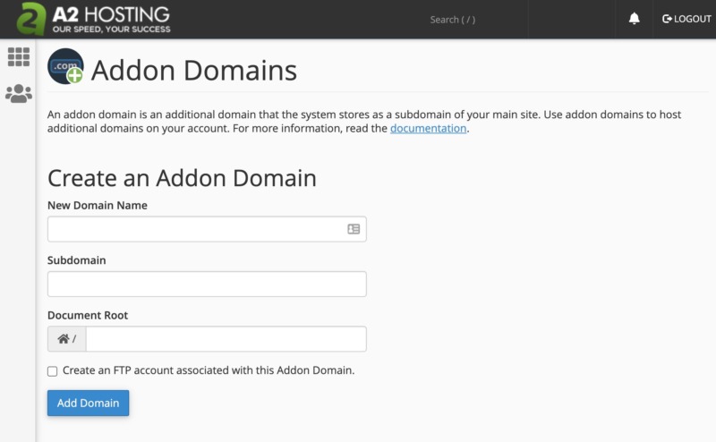 If you want to use File Transfer Protocol (FTP) with this domain, select the Create an FTP account associated with this Addon Domain checkbox. You can then select Add Domain, and cPanel will add this domain to your hosting account. You can repeat these steps, to create multiple add-on domains.