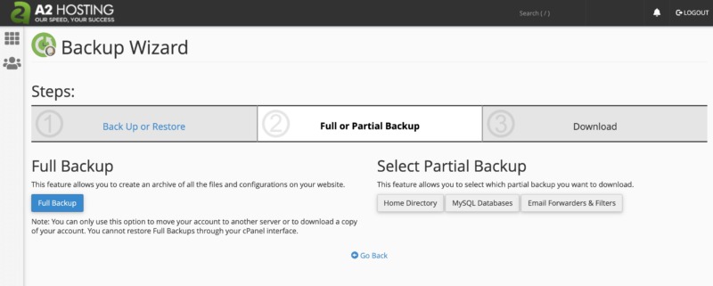 To start the backup process, select Back Up. Now, choose to either backup all the files on your website, or create a partial backup consisting of either your home directory, MySQL databases, or email forwarders and filters.